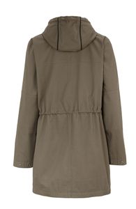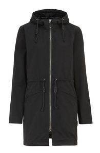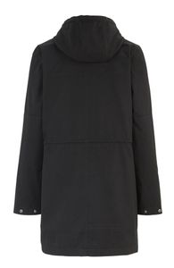 Bomullsjakke med fast hette i retrostil. Snorer i midje og linning. Helforet med YKK glidelås som går helt opp til krage/hette. Sterkt snørebånd med stropper både i hetten og hylse. Jakken har innerlomme.